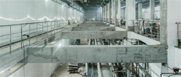 西安市第三污水處理廠并不只是簡單將地上的污水處理廠“下沉”,而是在充分考慮各類安全風險等因素后,重新統(tǒng)籌功能分區(qū),實現(xiàn)資源整合的最優(yōu)配置。項目采用分層布置形式,地下一層為操作層,為設備調控中心和人力檢修中心,地下二層為水處理構筑物和綜合管廊,污水處理廠的曝氣池、沉淀池等在這里“一應俱全”。同時,項目團隊結合施工方案對地下空間進行多維度優(yōu)化,形成立體三維布置,通過優(yōu)化工藝流程、重組單元組團、修改構筑物布局等方式,提升空間利用效率,將項目占地用地減少了三分之二。