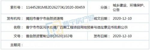 近日,依照《廣東省城鄉規劃條例》第二十九條規定,普寧市自然資源局發布了普寧市市區污水處理廠四期工程項目用地預審與選址意見書批前公示,具體內容如下: